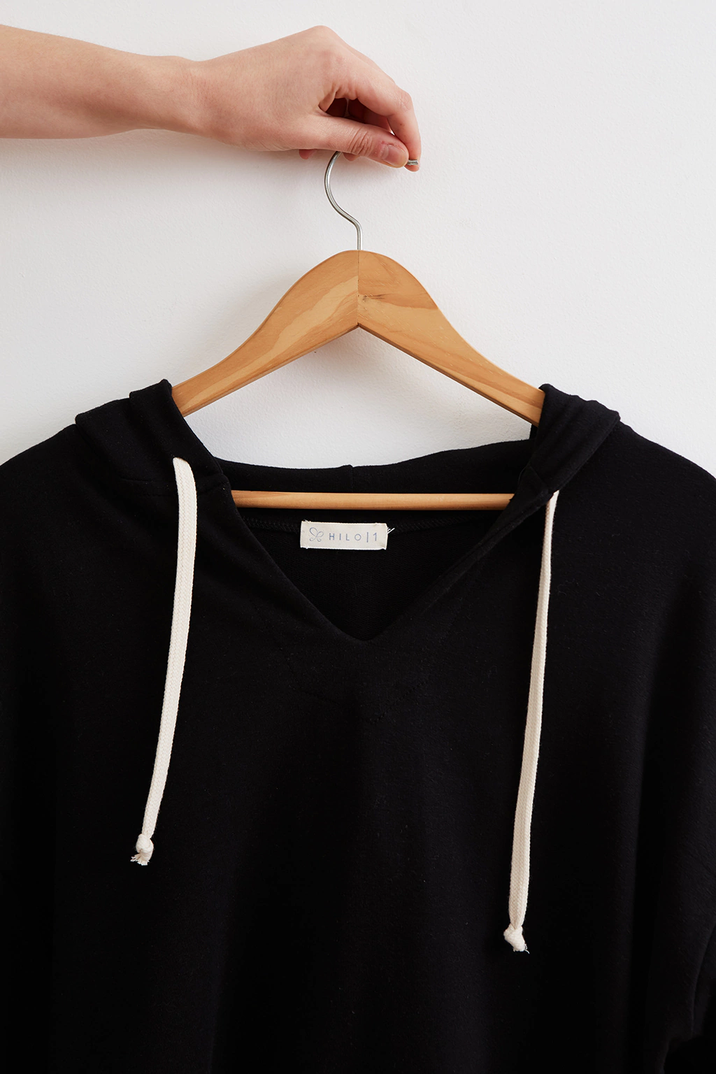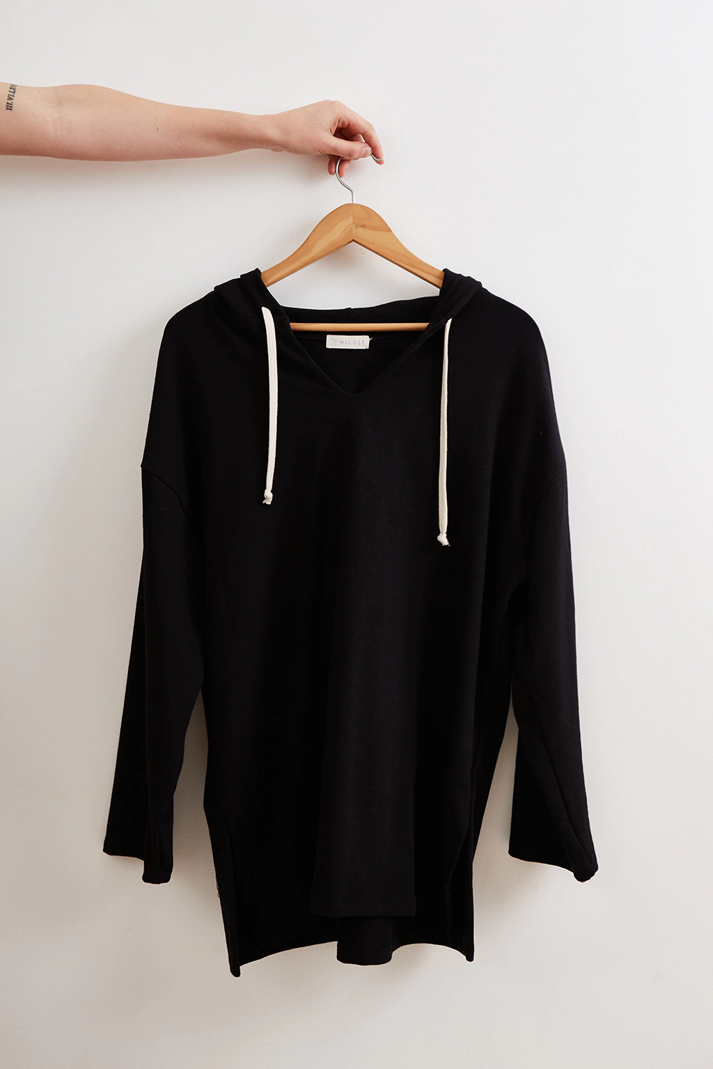 Buzo negro con capucha, manga larga y aberturas a los costados. De nuestra cápsula OUTDOOR! *Modelo SIN cierre-