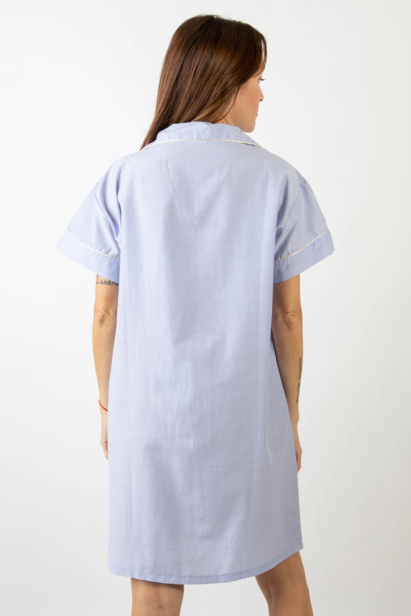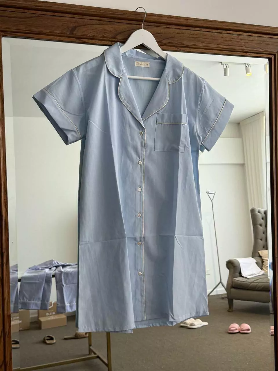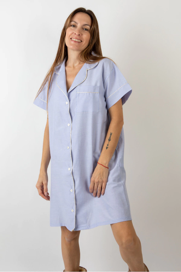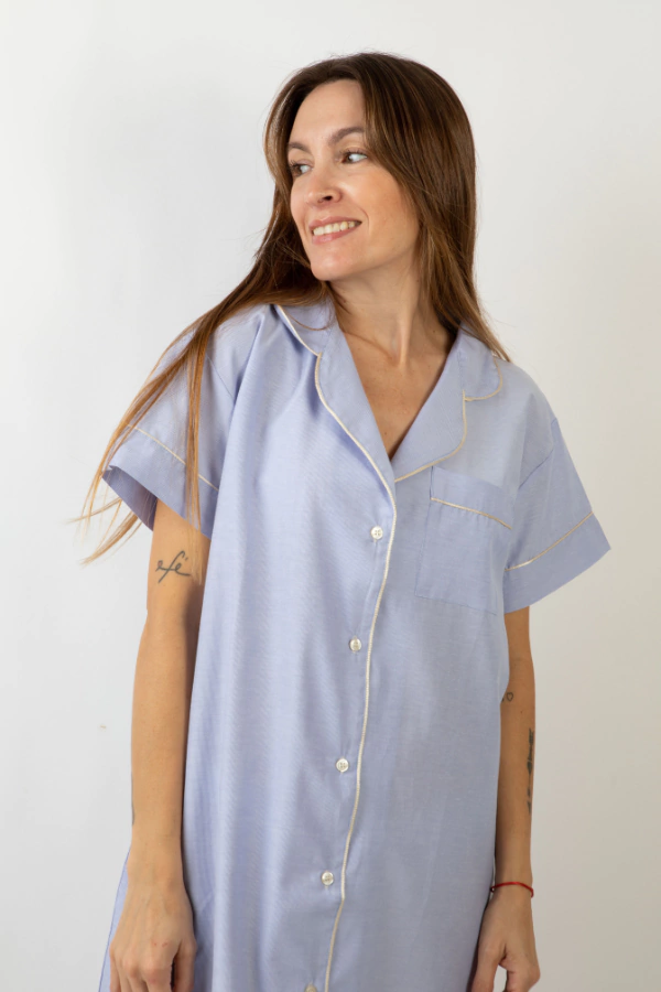Descubrí la comodidad y el estilo con nuestro Camisón Camisero celeste. Este camisón de manga corta está diseñado para ofrecerte una sensación de frescura y elegancia en tus momentos de descanso. Cuenta con cuello con solapa, y delantera abierta con botones.
