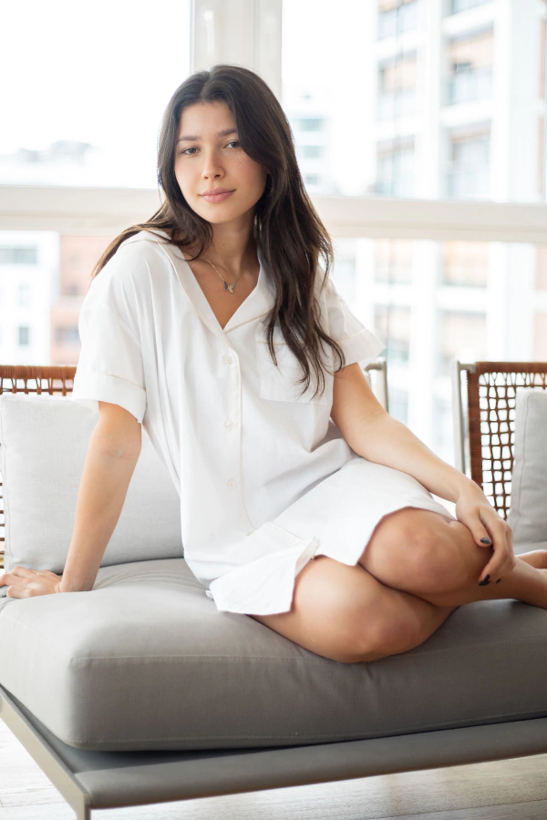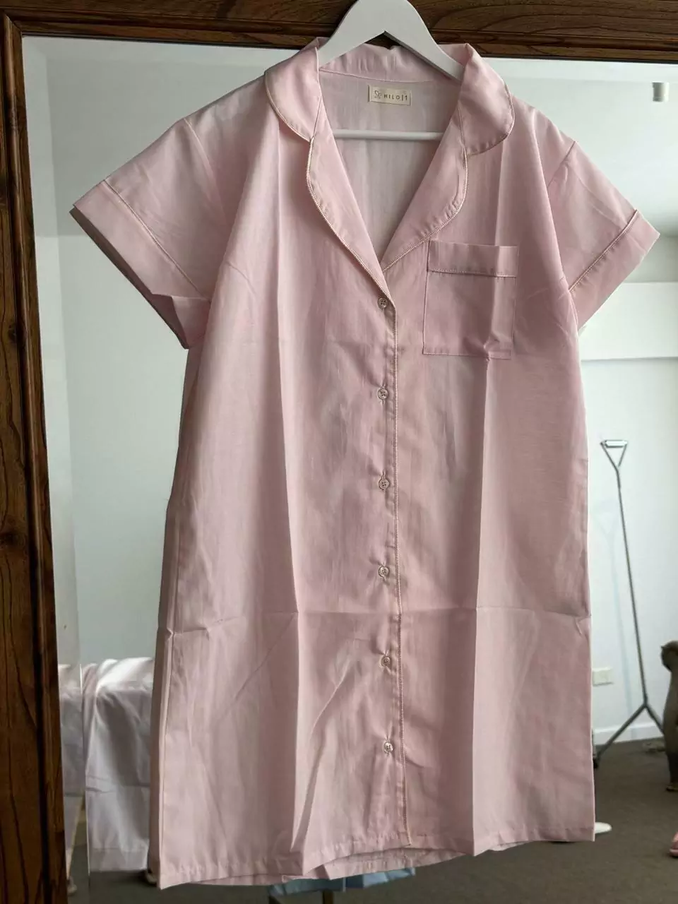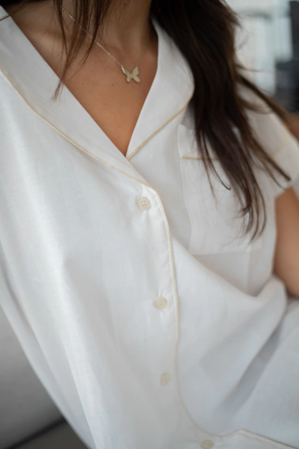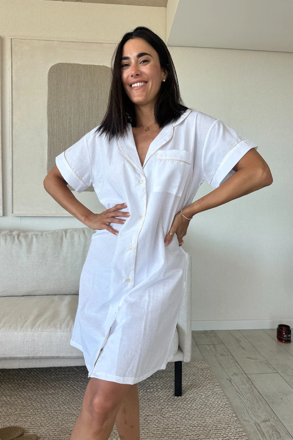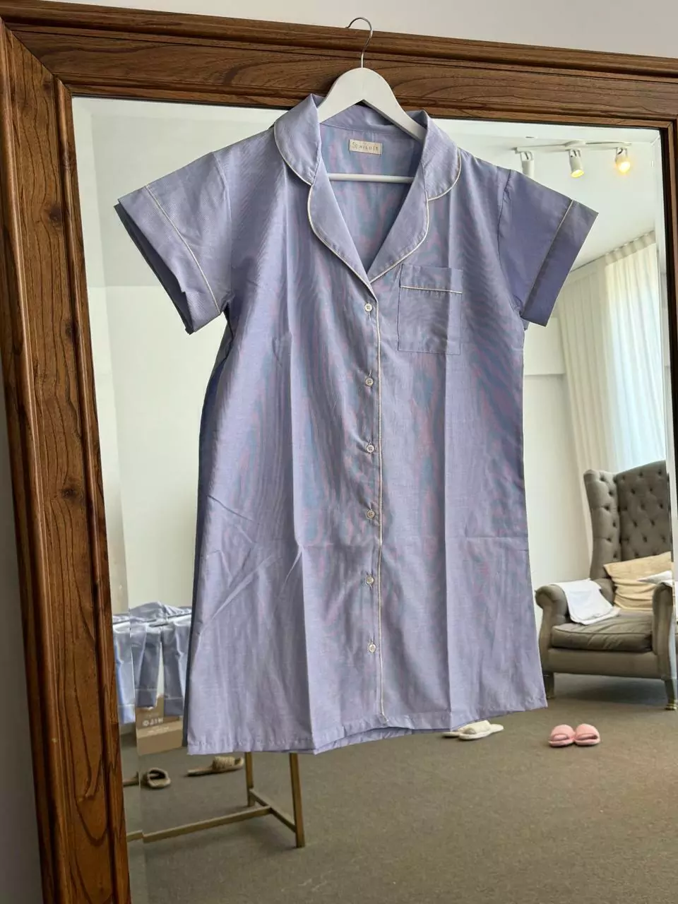 Descubrí la comodidad y el estilo con nuestro Camisón Camisero celeste. Este camisón de manga corta está diseñado para ofrecerte una sensación de frescura y elegancia en tus momentos de descanso. Cuenta con cuello con solapa, y delantera abierta con botones.