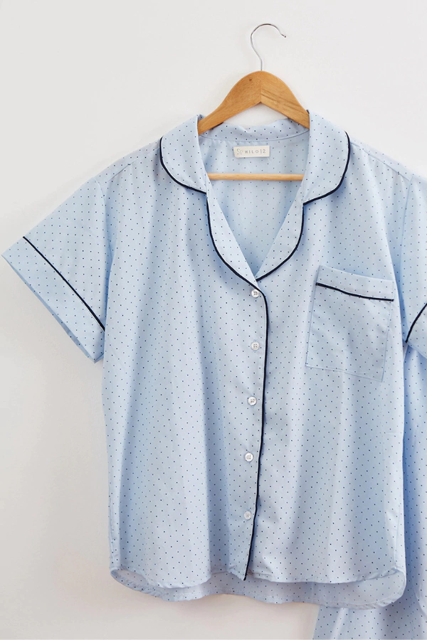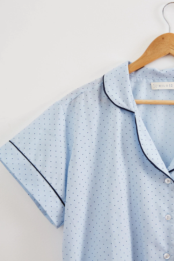 ¡Set de pijama celeste con puntos azul marino es todo lo que necesitas para estar cómoda y con estilo! Confeccionado con tela de algodón, es perfecto para tus noches de descanso. El pantalón de tiro medio-alto con elástico en la cintura se adapta a tu cuerpo sin apretar, y la camisa de manga corta con cuello solapa y escote en V te hace lucir genial incluso en casa.