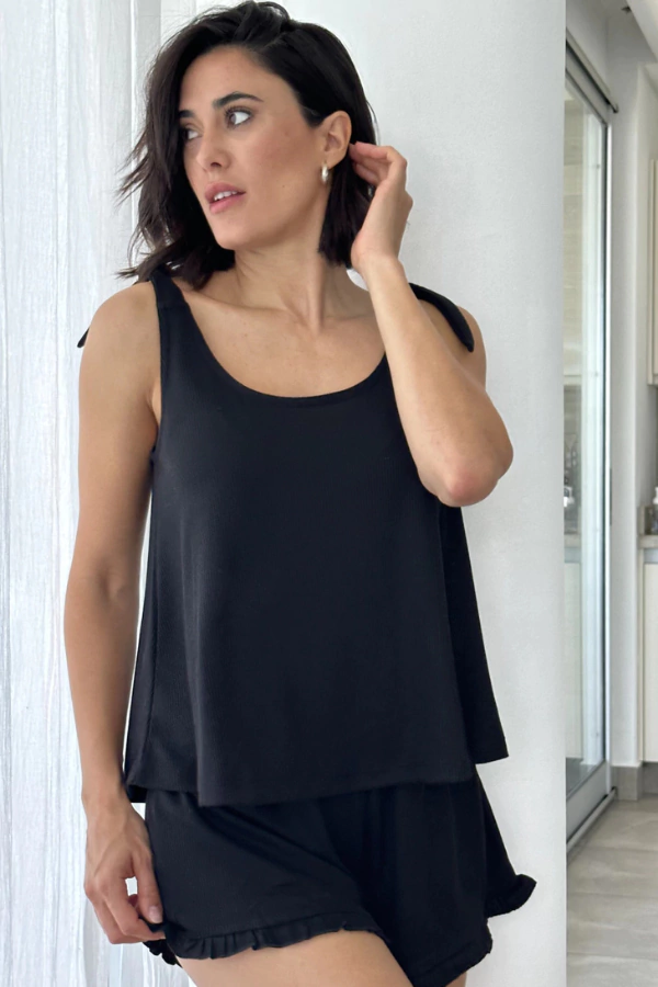 Conjunto Sol Short Negro, tu nuevo aliado para verte increíble y sentirte cómoda en casa. Este conjunto incluye un short de tiro medio-alto, con un elástico en la cintura que se adapta perfectamente a tu figura, y volados que añaden un toque especial. La musculosa, con su escote de cuello redondo, es tan suave que no te la vas a querer sacar :)