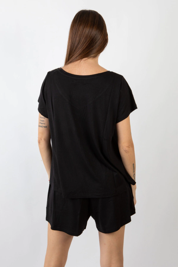 Comodidad y el estilo con el Conjunto de pijama de puro algodón con spandex. Este pijama está diseñado para brindarte una experiencia de descanso inigualable, gracias a su remera de manga corta con escote en V y un short cómodo y ligero.